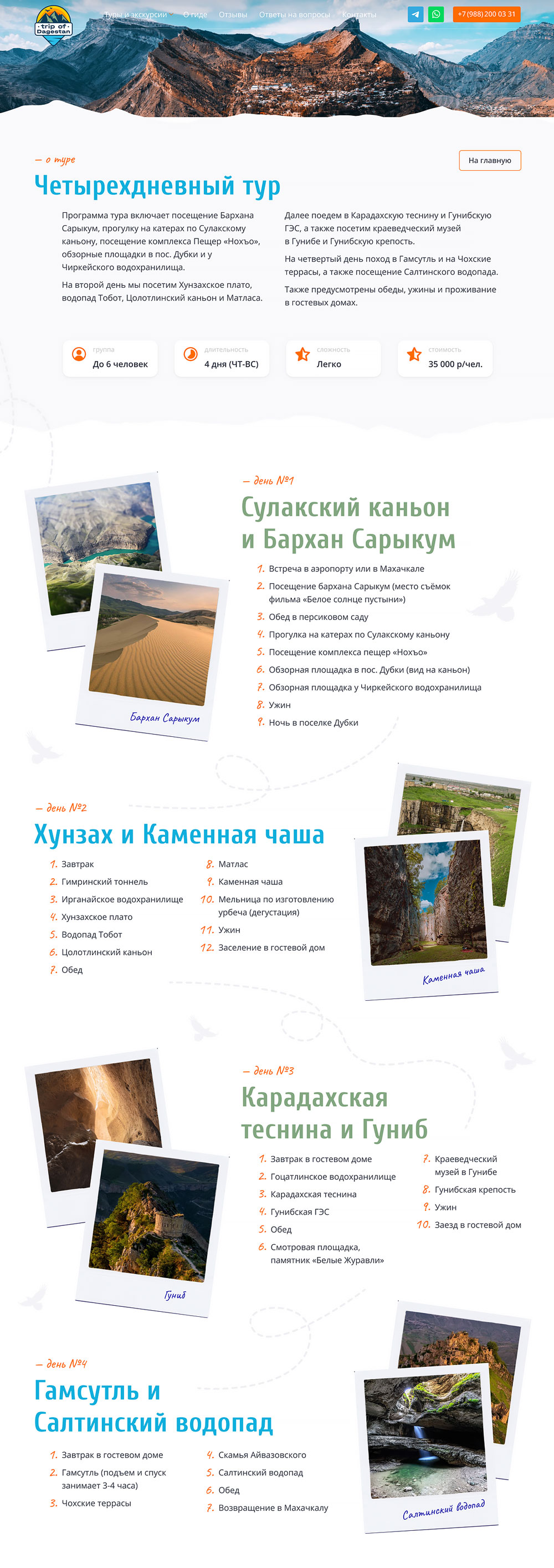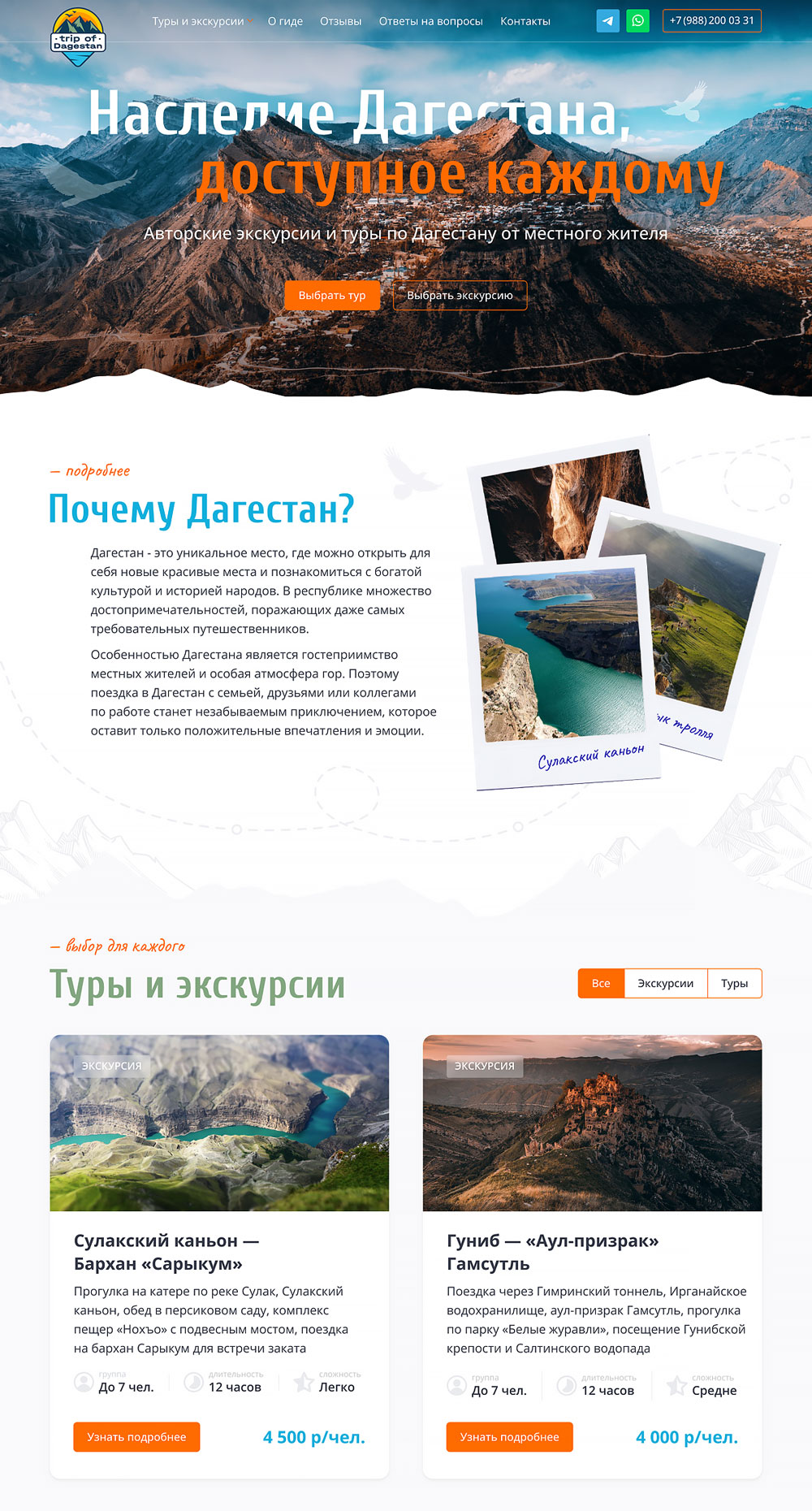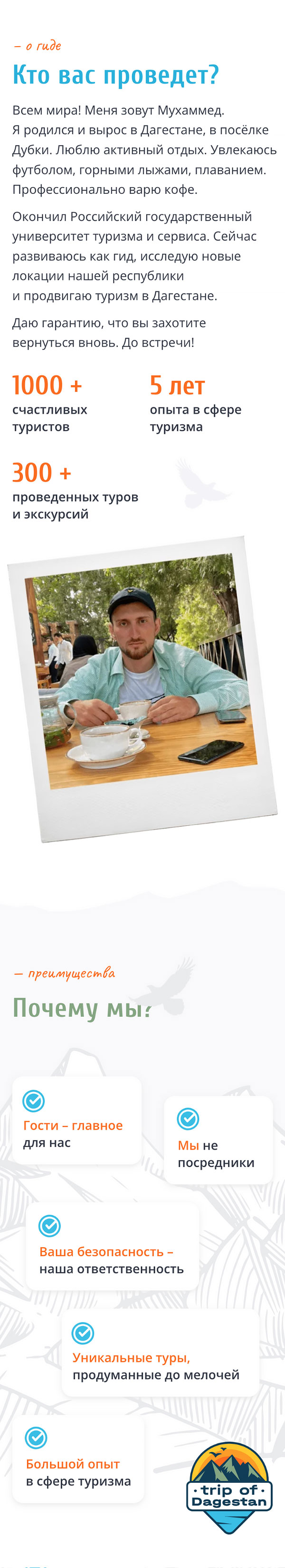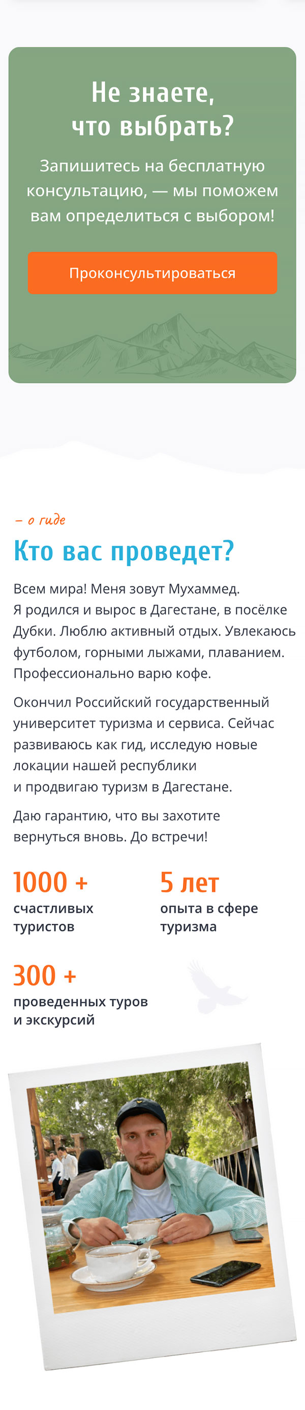 Гид из Дагестана активно развивает туризм в регионе. Он получает заявки через Instagram, но из-за блокировок появился риск потери этого канала. Также было сложно разместить подробную информацию о турах в формате соцсети. Для решения этих проблем и получения конкурентного преимущества он решил создать свой сайт.