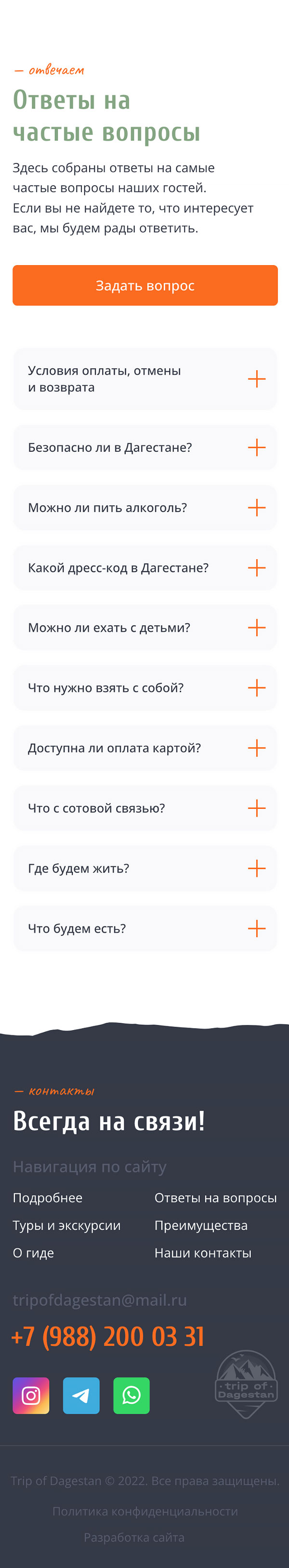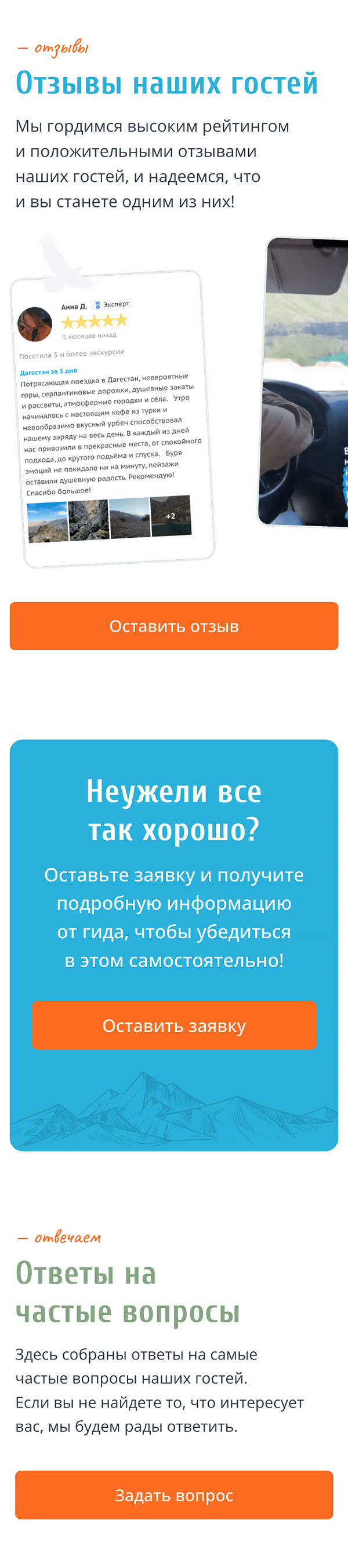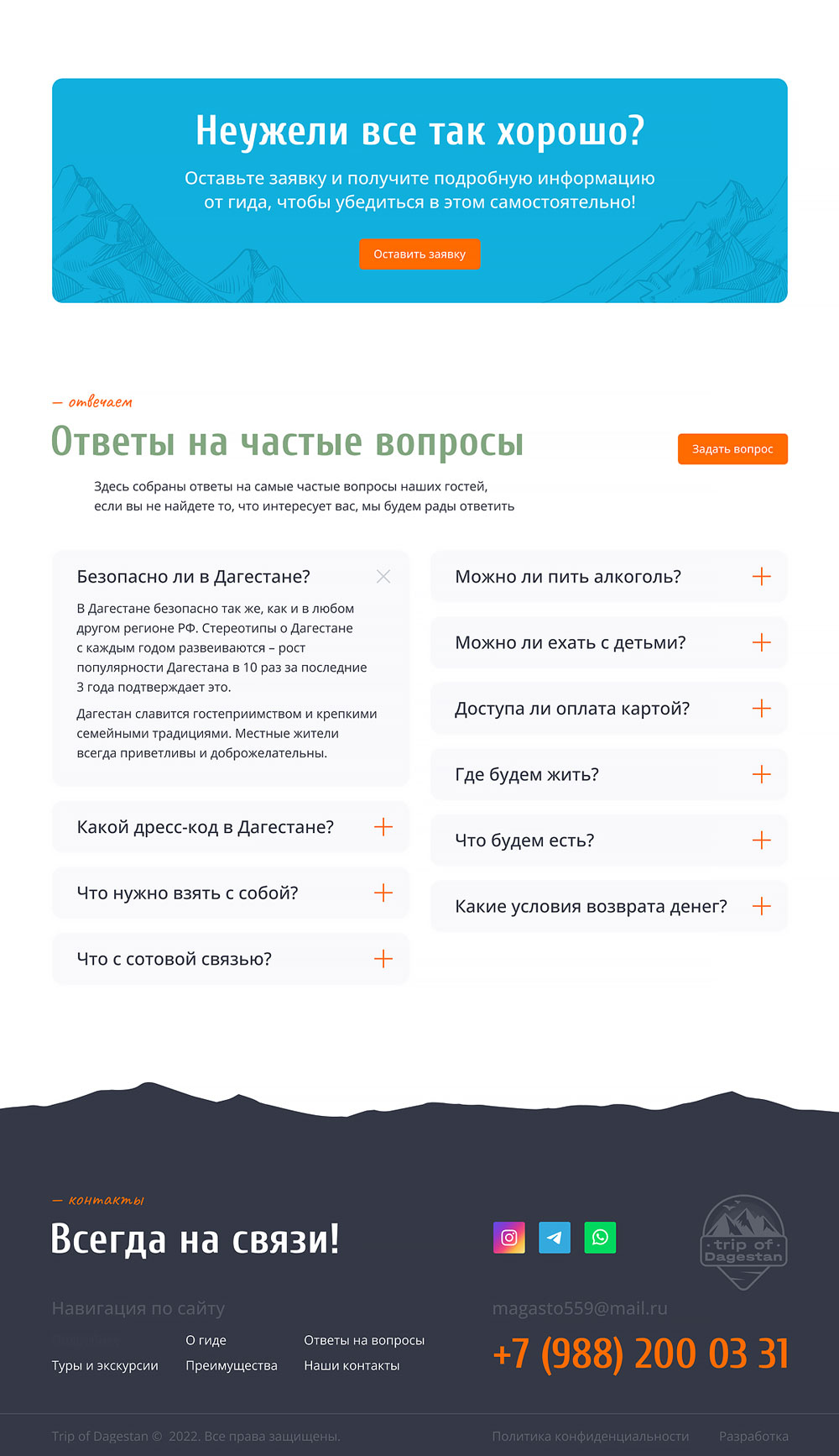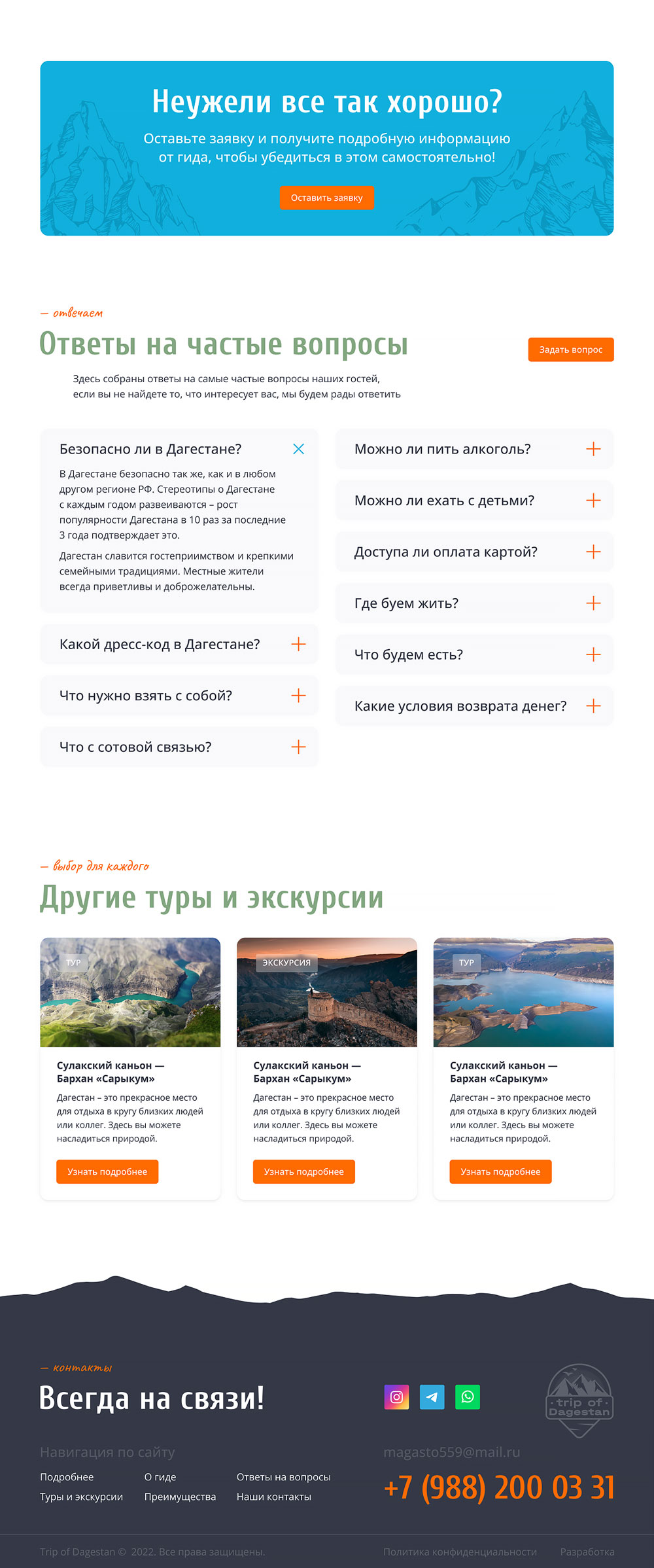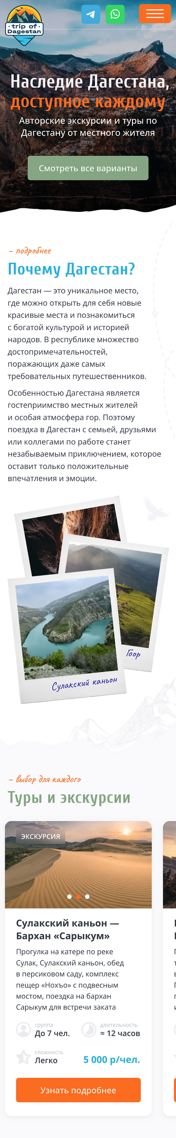 Гид из Дагестана активно развивает туризм в регионе. Он получает заявки через Instagram, но из-за блокировок появился риск потери этого канала. Также было сложно разместить подробную информацию о турах в формате соцсети. Для решения этих проблем и получения конкурентного преимущества он решил создать свой сайт.