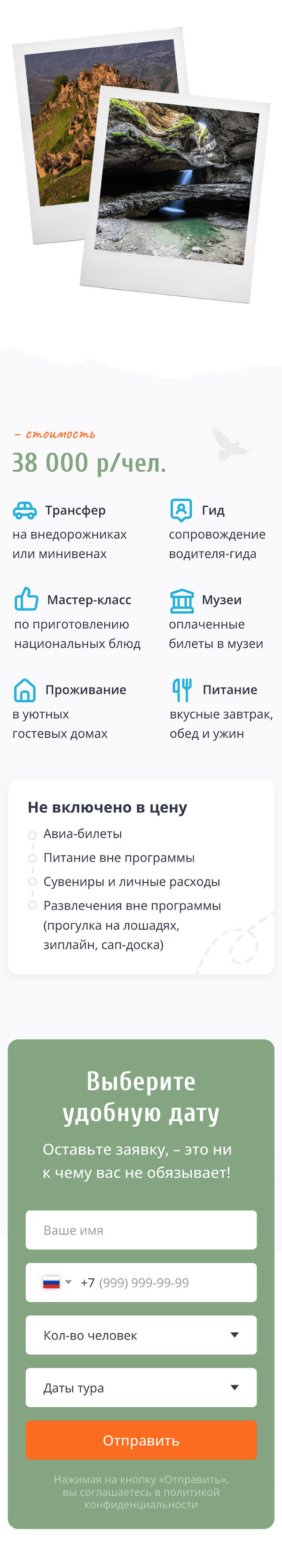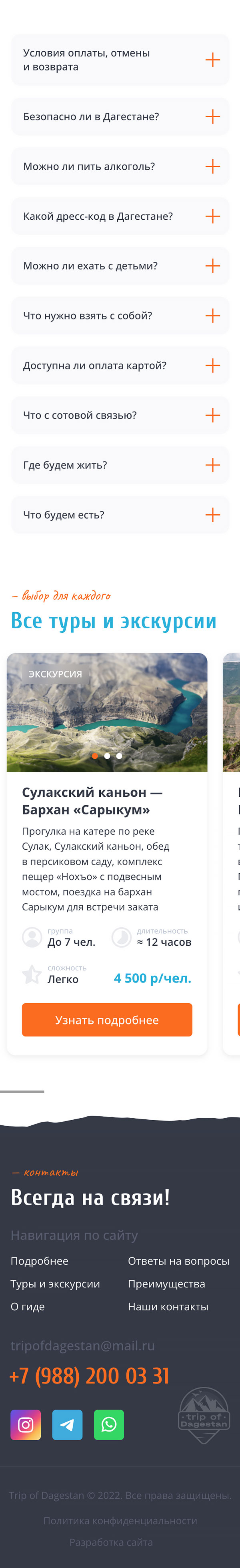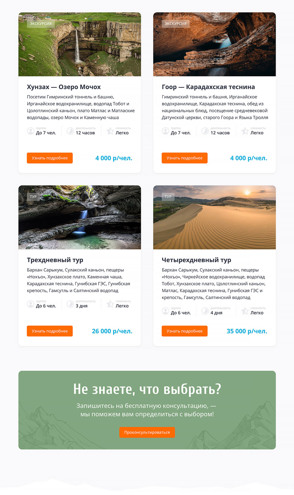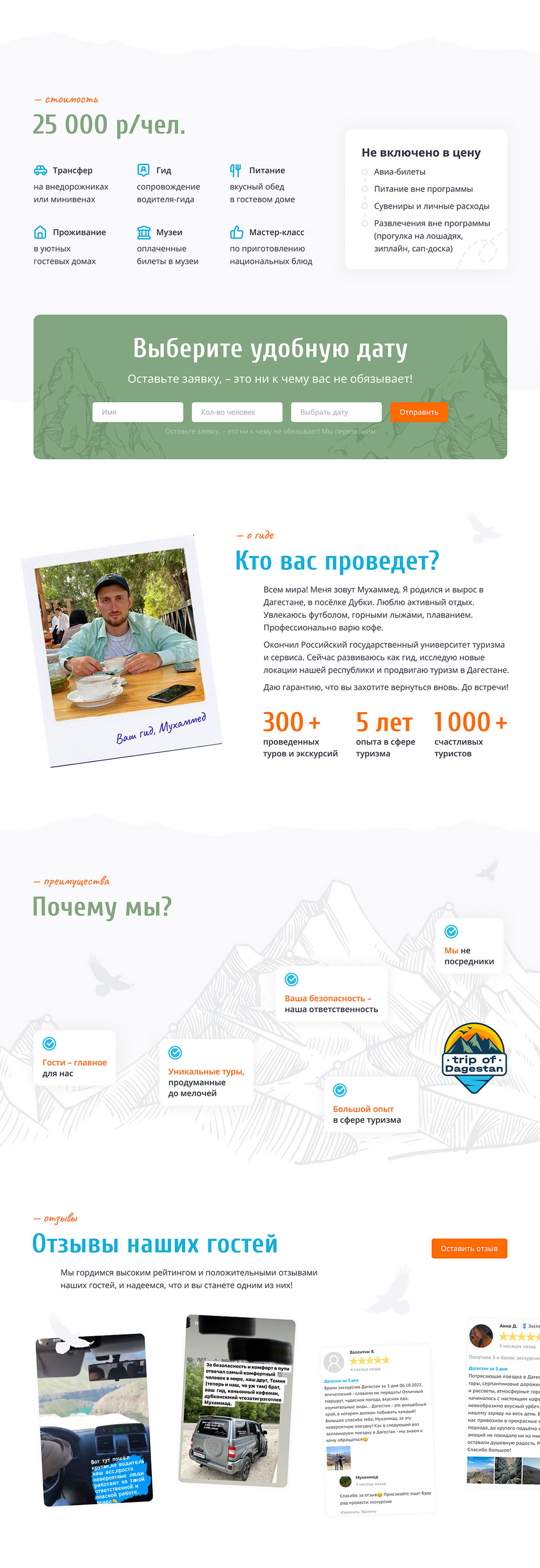 Цель сайта — мотивировать посетителей записаться на туры. Для этого мы сделали акцент как на визуальной привлекательности, так и на детальном раскрытии информации, чтобы клиенты точно понимали, за что платят.