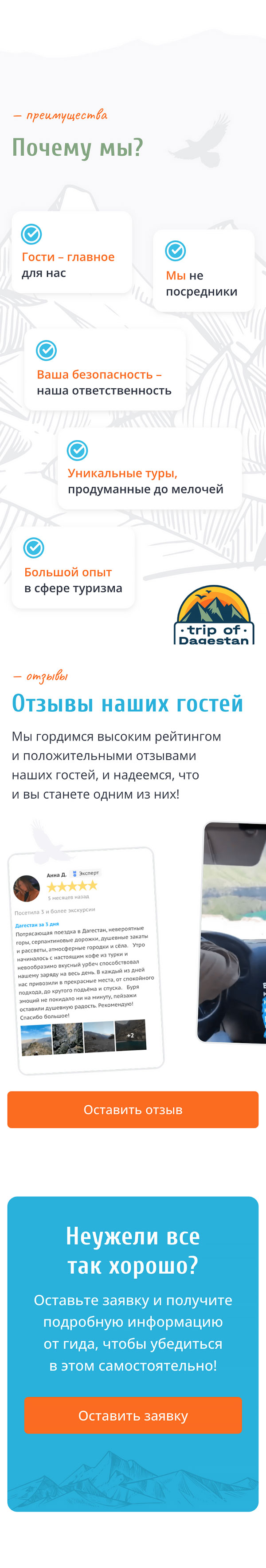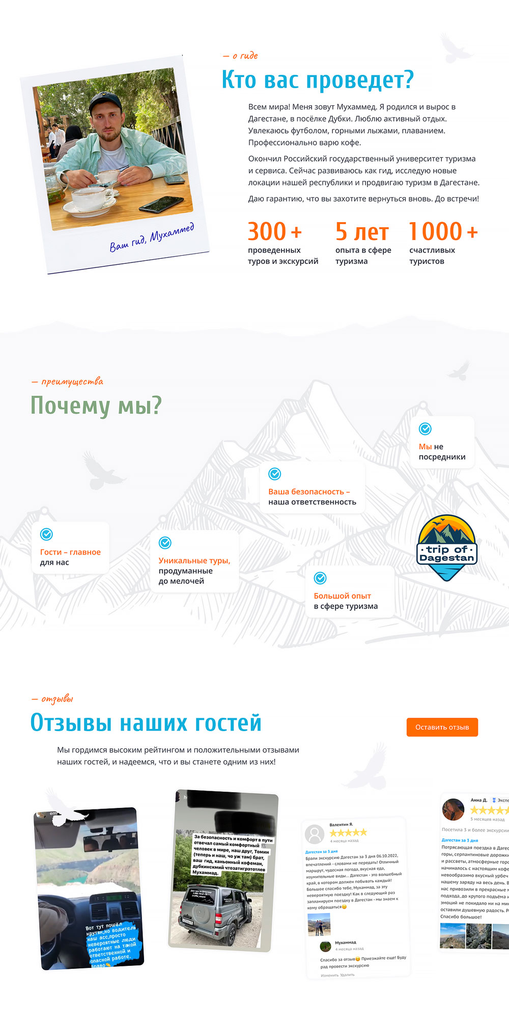 Мы стремились создать дизайн, который был бы не только интересным, но и тесно связанным с атмосферой Дагестана. Визуальные элементы, такие как горы и орлы, символизируют природу региона, которая привлекает большинство туристов. Переходы между блоками были стилизованы под силуэт горных вершин, усиливая ощущение местной уникальности.