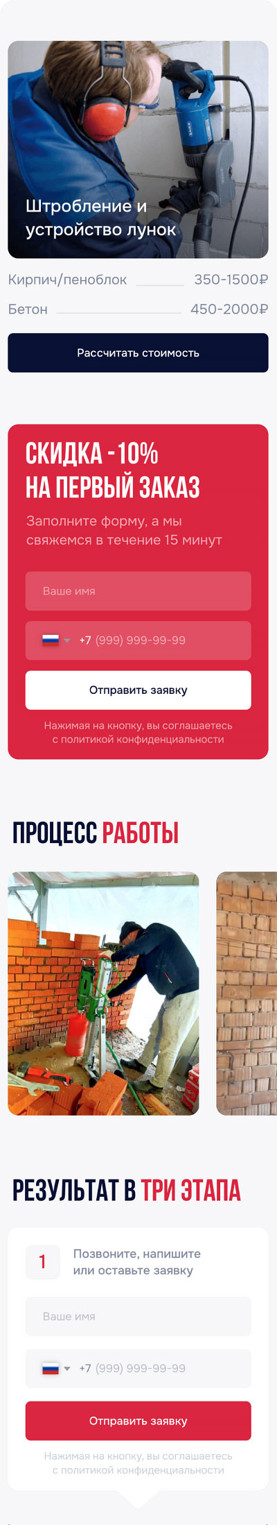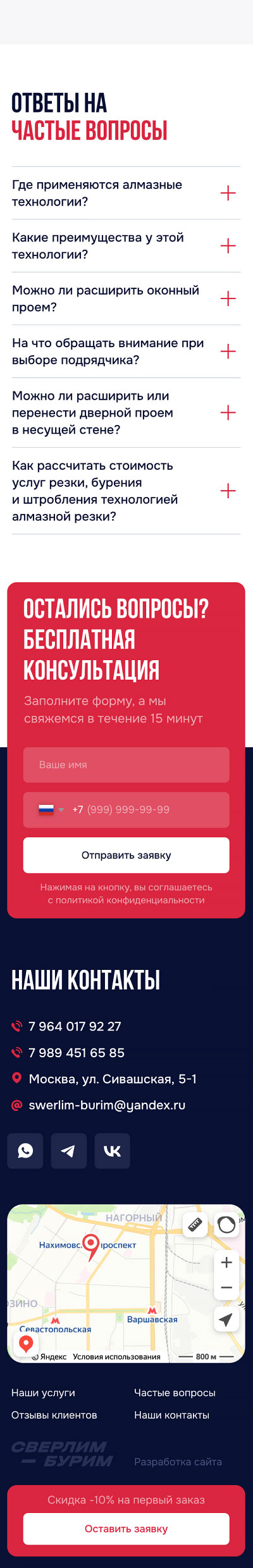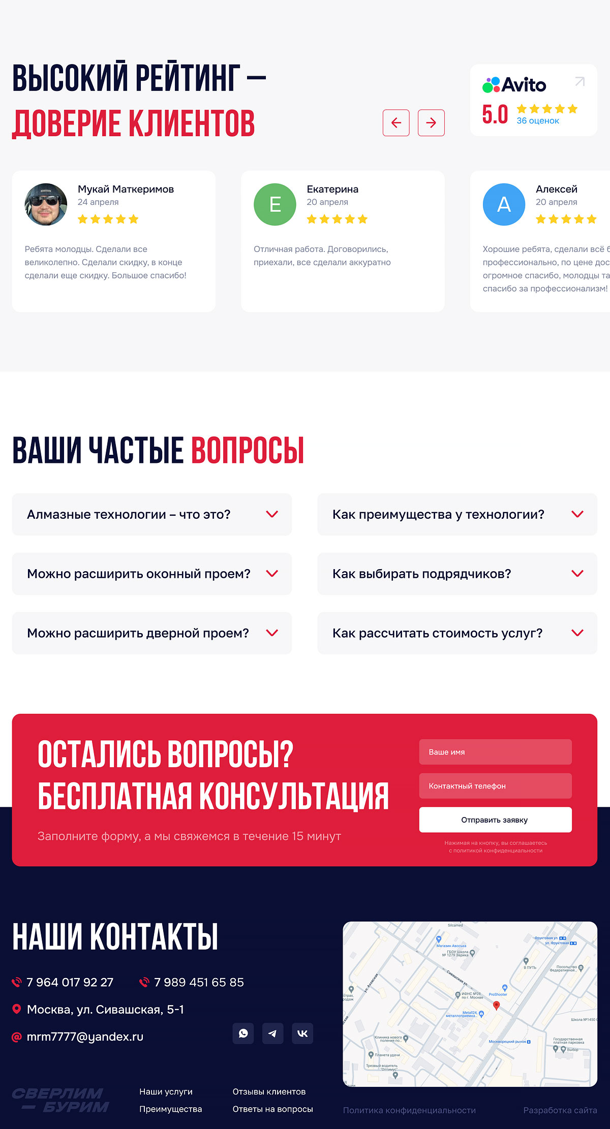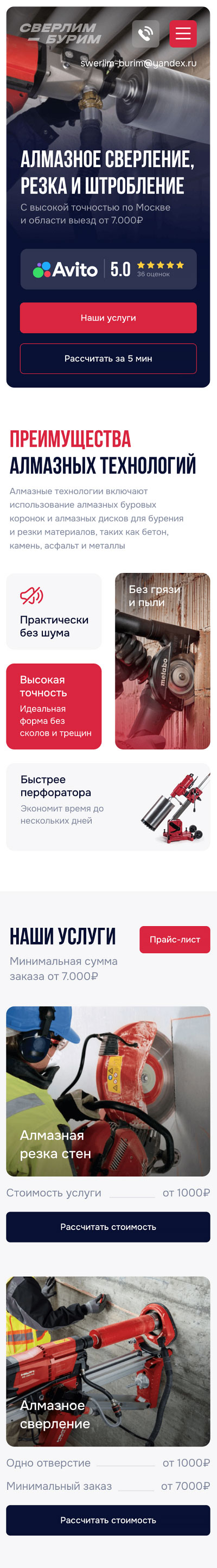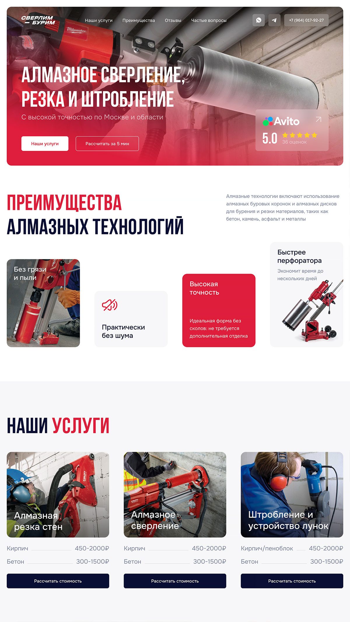 Компания, занимающаяся алмазной резкой, штроблением и сверлением, успешно закрепилась на Авито и получила высокий рейтинг. Для дальнейшего расширения руководство решило создать сайт как дополнительный канал продвижения, чтобы удобнее представлять сложные услуги и не зависеть от одной платформы.