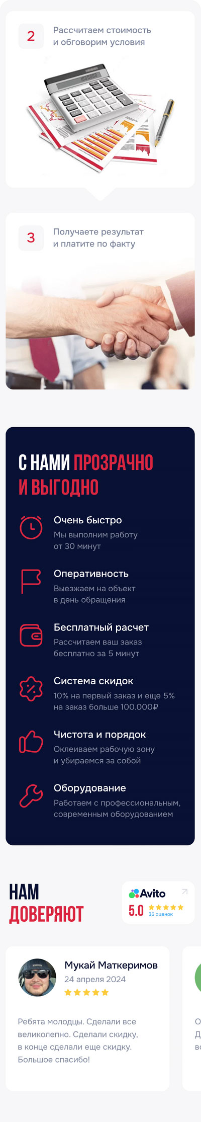 Мы акцентировали внимание на преимуществах сервиса, подробно описали каждую услугу, условия сотрудничества и включили раздел с ответами на частые вопросы, чтобы устранить возможные сомнения клиентов. Важным элементом стал блок с высоким рейтингом компании — мы выделили его на первом экране и добавили отзывы с возможностью перехода на Авито, чтобы усилить доверие.