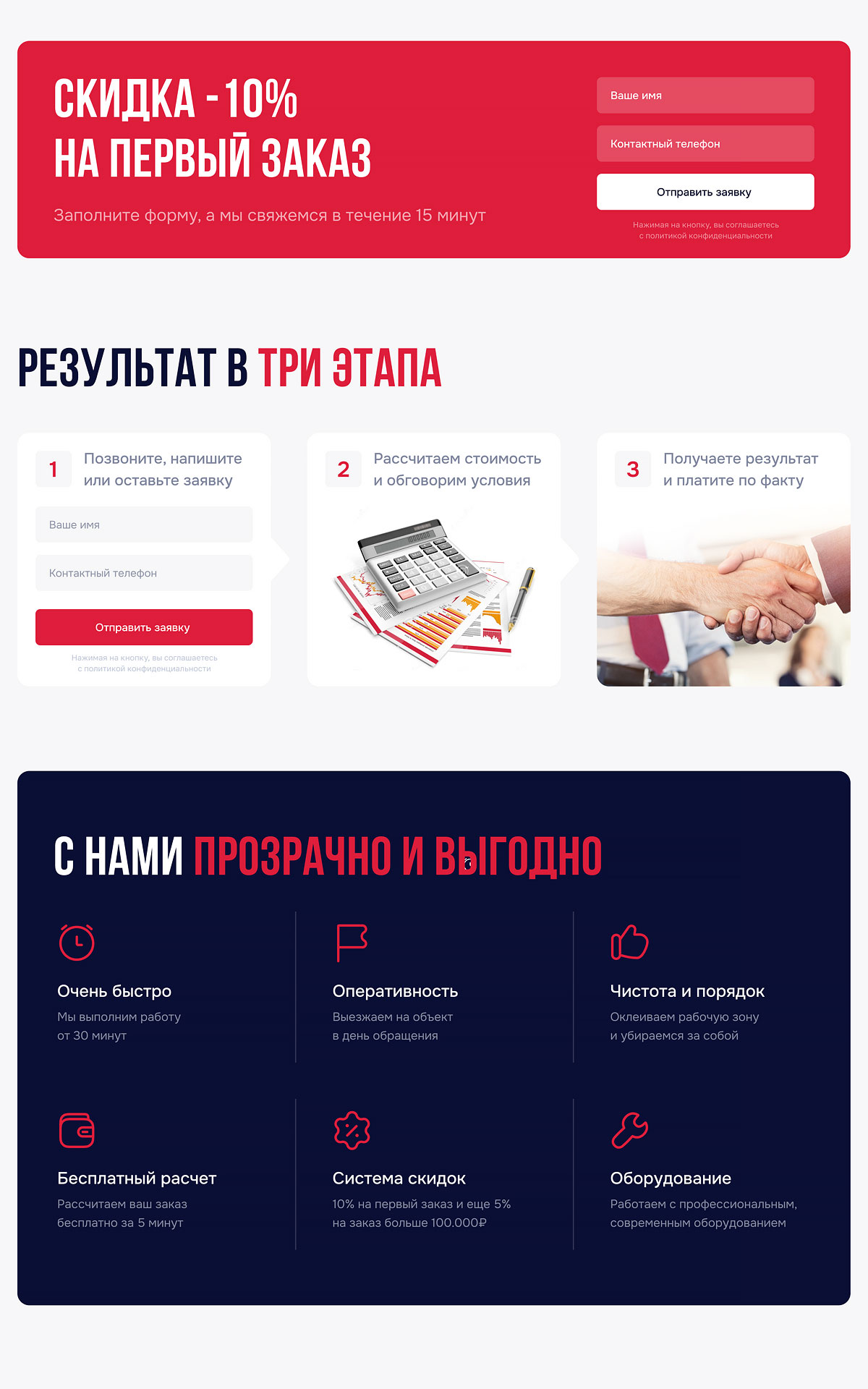 После анализа конкурентов и страницы компании на Авито, было решено создать сайт в одностраничном формате. Основные услуги компании всего три, и небольшой объем информации позволил компактно разместить все на одной странице, сохраняя удобство навигации.